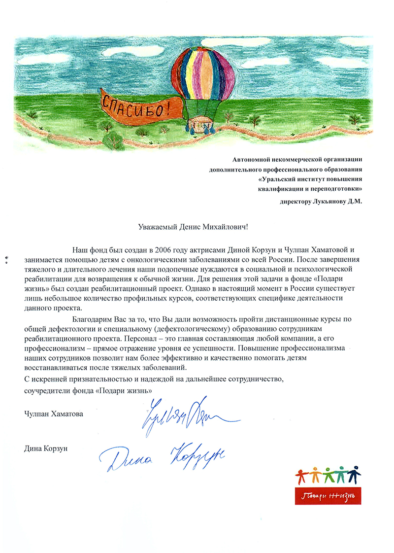 от образовательных и социальных организаций (в том числе Фонда «Подари жизнь» Чулпан Хаматовой и Дины Корзун)