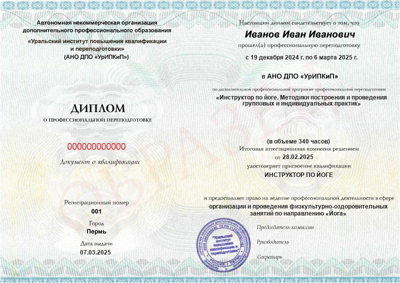 Помимо знаний, вы получите диплом о профессиональной переподготовке, который позволит официально вести практики йоги.