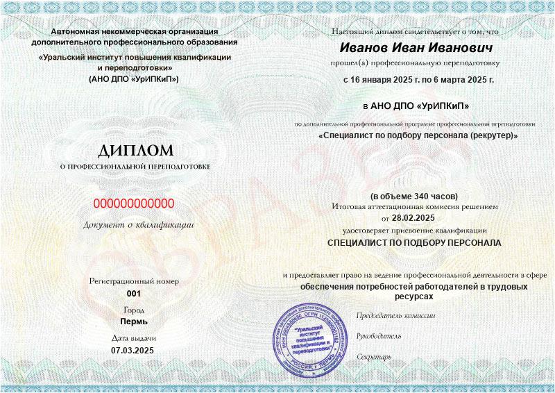 Диплом о профессиональной переподготовкеДиплом действует на территории всей Российской Федерации и признается государственными и частными организациями.