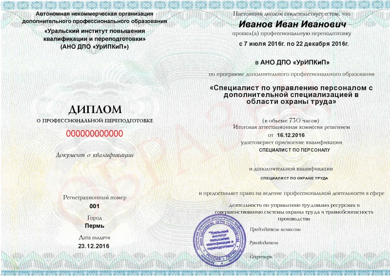 • Диплом АНО ДПО «УрИПКиП» — документ утвержденного образца, признается работодателем, а также комиссией при аттестации