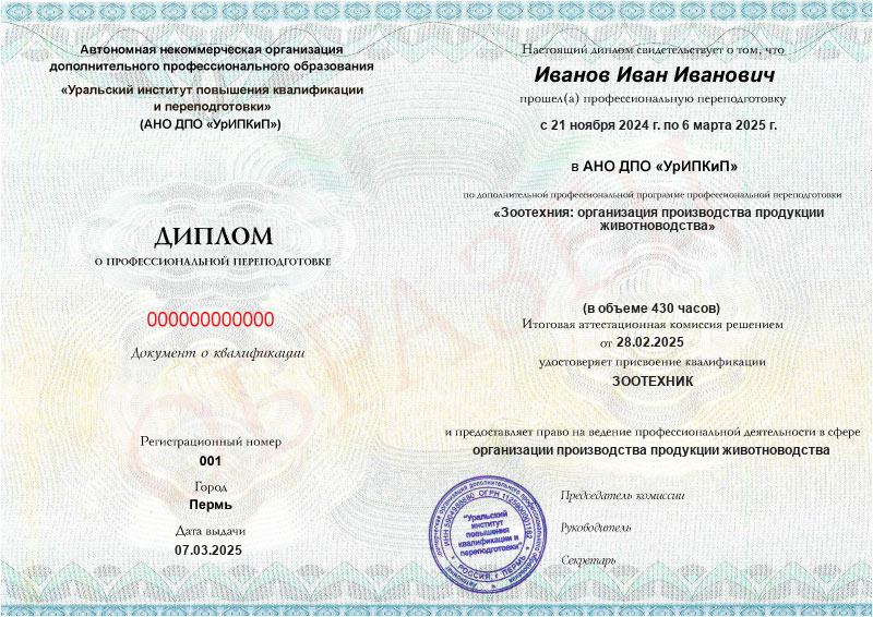 - Диплом о профессиональной переподготовке с присвоением квалификации «Зоотехник»